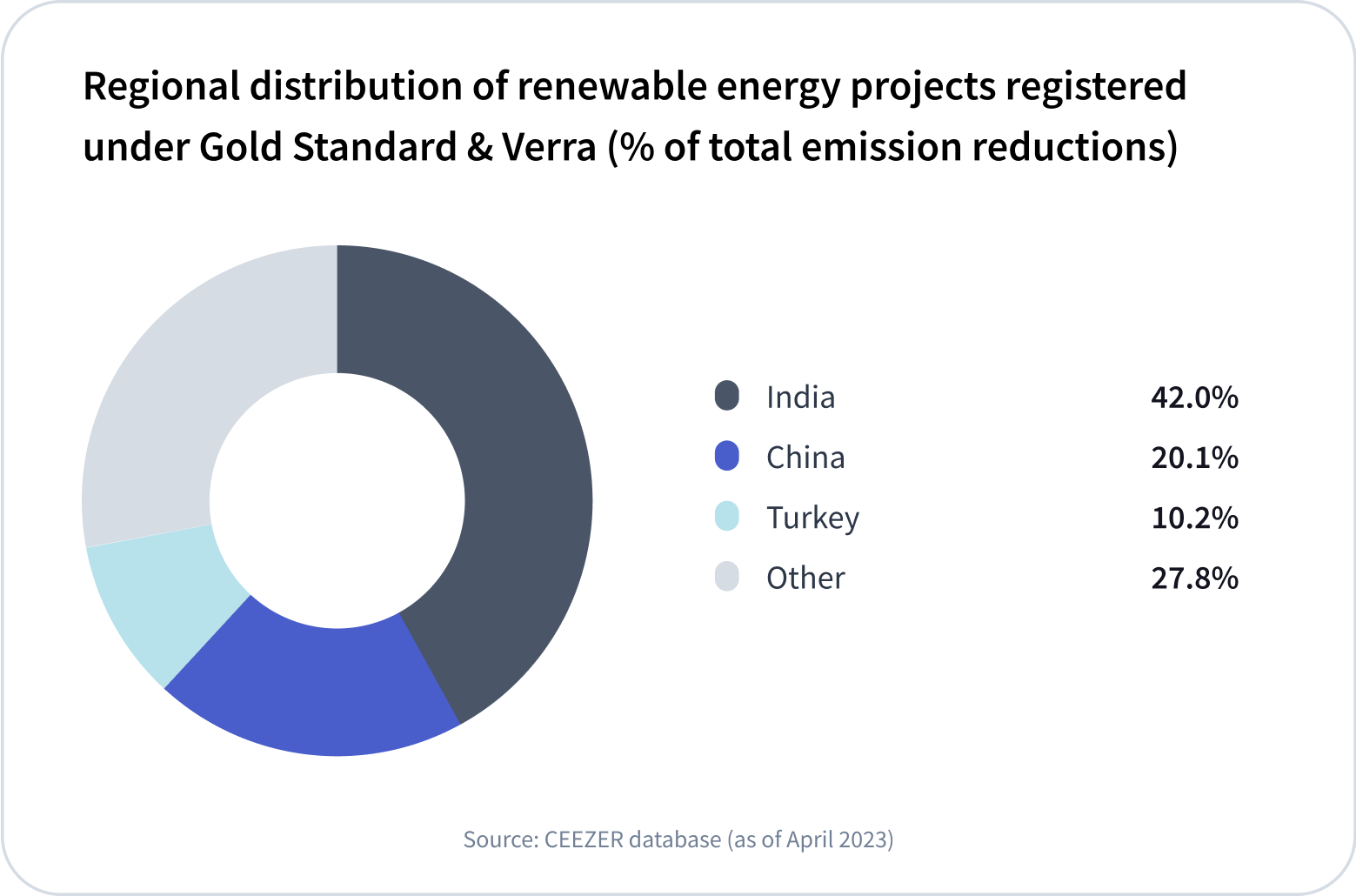 The current renewable energy carbon credit market is large, accounting for over two gigatons of avoided emissions annually. As of April 2023, CEEZER has visibility on over 2,652 renewable energy projects (generating almost 300 million carbon credits) from leading standards, which account for around 40% of all projects (25% of all credits) in the VCM.